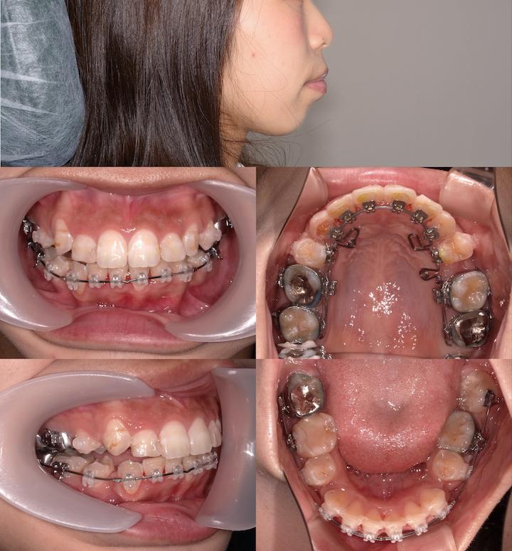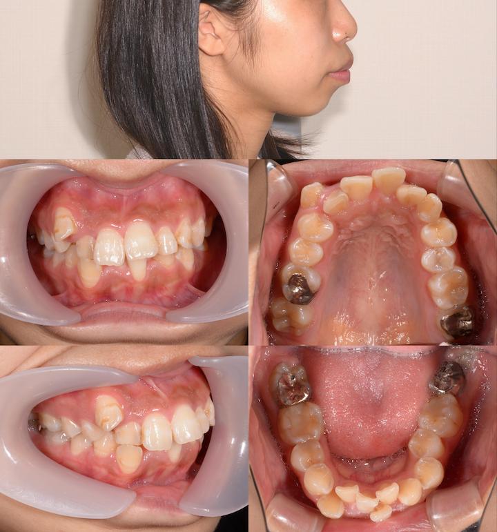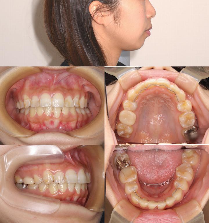 下の前歯が1本足りなかったため、上顎歯列の後方移動と上の歯の幅を小さくすることで前歯が噛み合うようにしました。