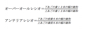 上あごの歯12本の幅の合計と下あごの歯12本の幅の合計の比率を計算する方法と、上あごの前歯6本の幅の合計と下あごの前歯6本の幅の合計の比率を計算する方法があります。